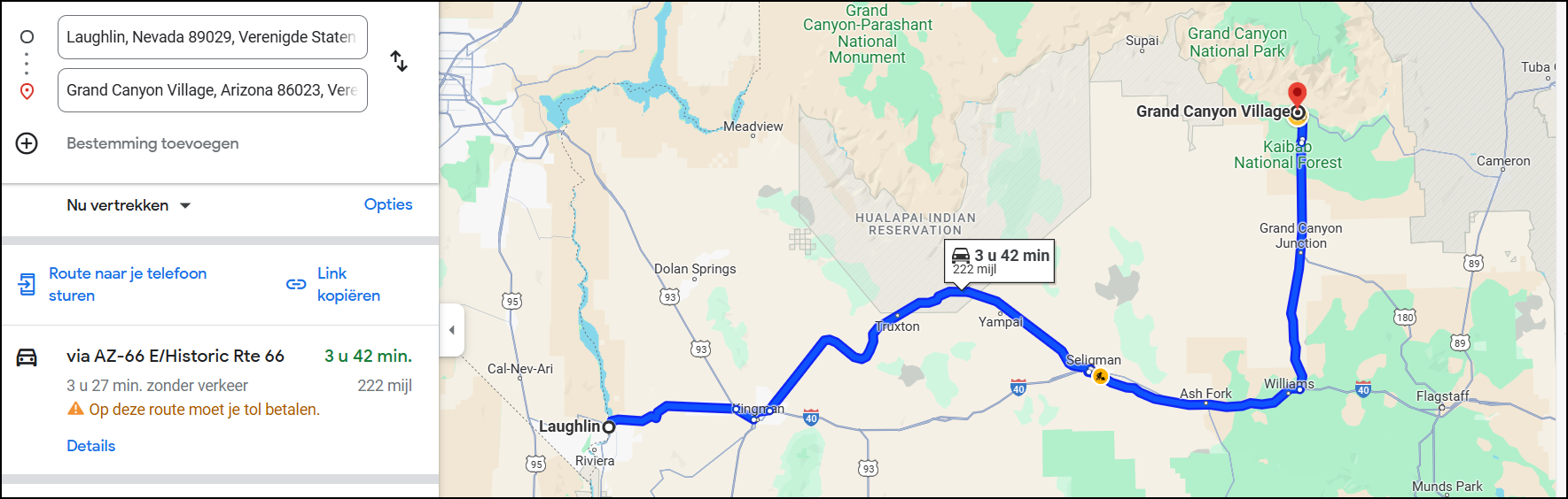 Jazeker. Rechtstreeks is het iets meer dan 3 uur rijden. Via Rte 66 is het een kleine 4 uur, zie hieronder.Con5421 schreef: ↑23 jun 2024, 18:18Ik ben naar de optie aan het kijken voor de Grand Canyon. Is het te doen om van Laughlin naar Grand Canyon te rijden met tussenstops, daar te overnachten en dan de volgende dag de Grand Canyon te bezoeken en in de avond slapen in Flagstaff. Flagstaff kan ik niet meer annuleren.