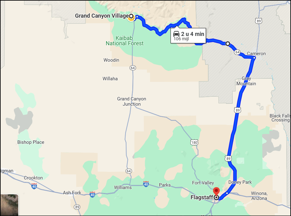 Van de GC naar Flagstaff is het 1,5 uur rijden, dus dat is goed te doen na het bezoek aan het park. Het mooiste is om via de 64 te rijden en onderweg nog wat stops te maken. Het is dan ruim 2 uur rijden: