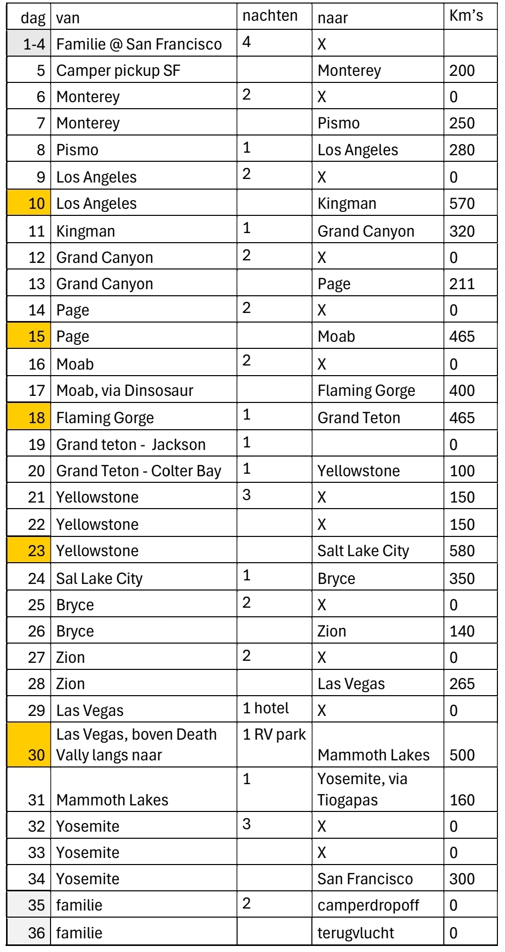 Soms 2 nachten i.v.m. een te boeken activiteit op een niet-rij-dag. Maar bij Grand Canyon en Bryce de dubbele nacht toch weggehaald. Een extra nacht Yellowstone en Bear Lake en Capitol Reef in de Route.
