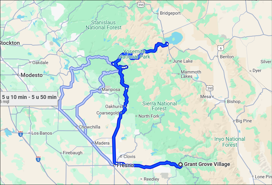 Als je de Tioga Pass neemt en daarna Sequoia wilt bezoeken rij je door Yosemite en dan via de 41 en Fresno naar Sequoia. Zie hieronder de route vanaf Lee Vining: