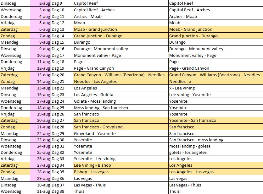 In de (1e)route in de tabel, hebben we vanuit Needles ook een verplaatsingsdag richting LA.