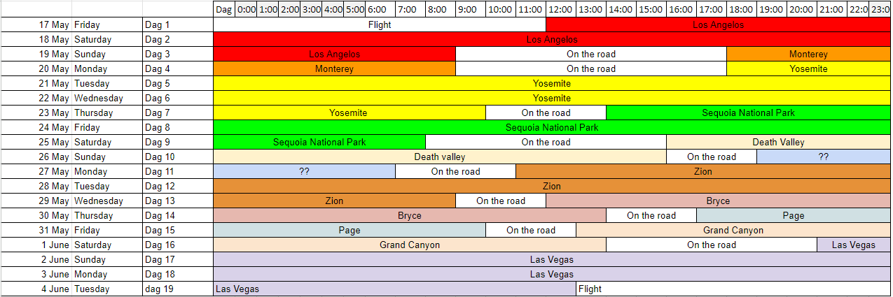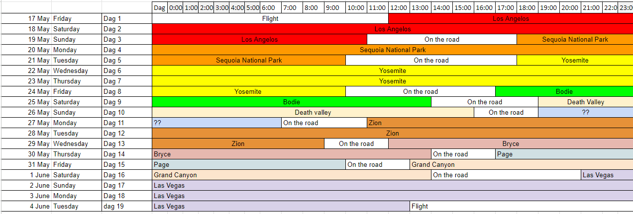 Ik heb de planning nu visueel gemaakt. Reistijden zijn grofweg en kunnen uiteraard nog schuiven. Dat weekend van Memorialday vind ik nog wel lastig.
