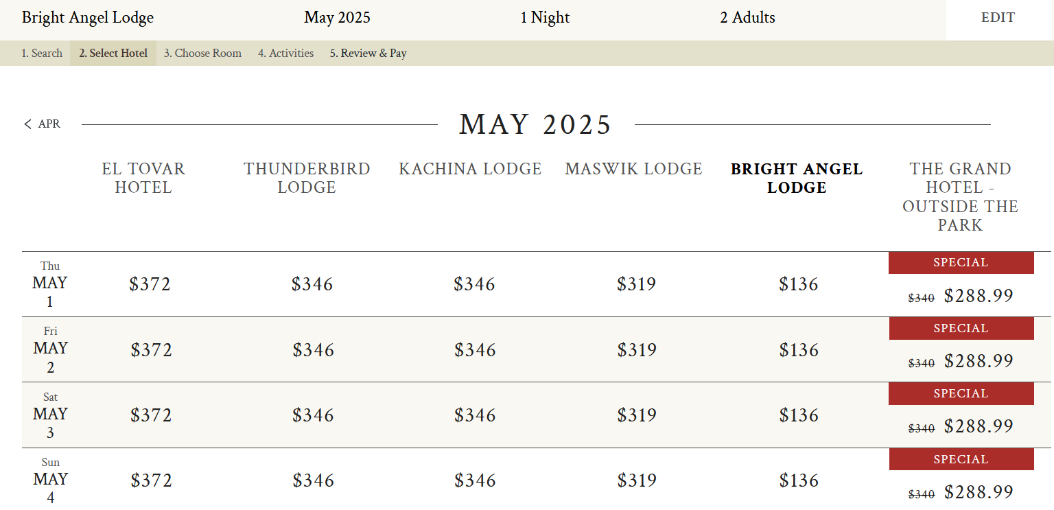 Via https://www.grandcanyonlodges.com/ zie ik voor de hele maand mei 2025 vrije kamers vanaf $136