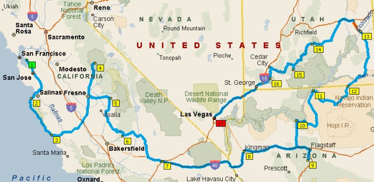 Vorige keer (2008) zijn we van LA naar de parken gereden (Lake Perris, Joshua Tree, Flagstaff, etc..), toen Las Vegas, Yosemite, de Highway 1 en weer LA. Achteraf gezien zijn we toen te snel gegaan. Bijna overal maar 1 overnachting en dan weer door. We willen nu minder plekken bezoeken, waar we dan wel 2 of 3 nachten blijven. Aan het begin en eind hebben we 3 dagen San francisco en Las Vegas (zonder camper), en daar tussen willen we met de camper proberen in ieder geval Yosemite Valley, de Highway 1, Moab, Monument Valley, Page en de Grand Canyon te bezoeken.