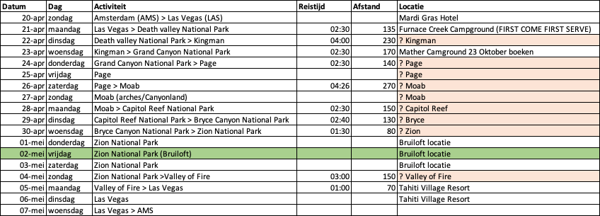 Ik ben nu een beetje aan het puzzelen wat een logische route is zodat we veel kunnen zien maar ik wil ook een beetje op de kosten letten. Onze voorkeur gaat uit naar het bezoeken van enkele national parken aangezien we graag wandelen, maar voor de afwisseling ook wat steden zoals Las Vegas. Qua accommodatie willen we gebruik maken van camper aangevuld met wat hotel overnachtgingen. In Zion hebben kunnen we daarnaast gebruik maken van de trouwlocatie en hebben we dus ook niet perse een hotel of camper nodig.
