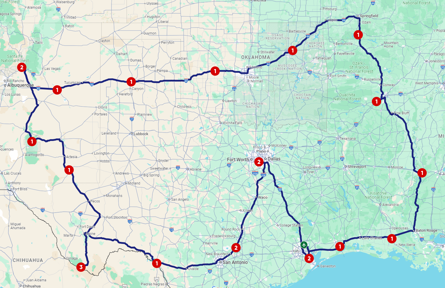 Hieronder een kaartje van de route die we gaan rijden. We starten in Houston en rijden dan met de klok mee. De cijfers geven het aantal overnachtingen aan dat we op die plek blijven.