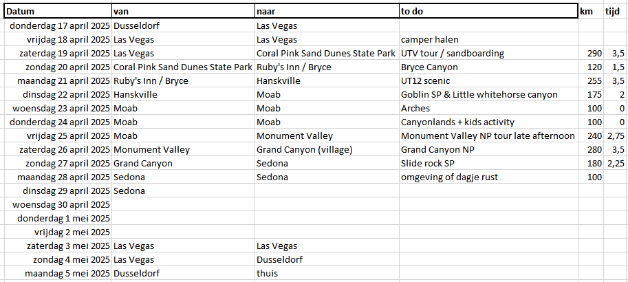 Wat ons betreft kunnen we alle kanten nog op, dus alle tips zijn welkom. Moab hebben we er in gezet omdat we er ooit waren en graag nog eens terug gaan. Genoeg te zien en doen. :-) Bryce lijkt ons een leuk park met kinderen. Zion slaan we vooralsnog bewust over (druk en heel veel wandelen en moeten wat selectiever zijn). Grand Canyon eigenlijk ook overgeslagen, maar als je zo dicht bij bent dan moet je er haast toch wel (weer) langs ... en kamperen vlakbij de Grand Caynon lijkt me een prachtige ervaring. :) Heel graag vinden we ook nog wat mooie plekjes aan het water. Zwemmen of bootje varen, je weet wel. Iets meer Arizona mag ook.
