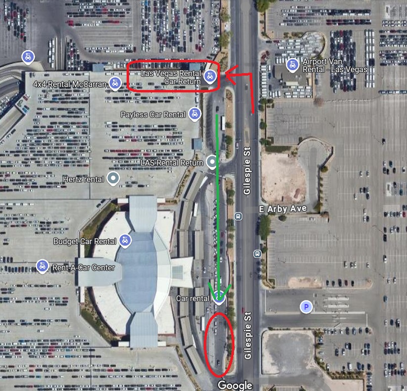 Dan het inleveren van de auto. Wij rijden vanaf Henderson terug naar de airport en met de auto rij je direct de garage in als je van de weg afslaat. Met de camper kun je dan ''voorlangs'' het Mc Carren Center rijden waar ook de shuttlebussen heen gaan. Je rijdt dan zover mogelijk door naar de achterste taxistandplaats. Daar staat bijna nooit iemand. Volg groene pijl naar rode cirkel. Als de auto ingeleverd is loop je via de centrale hal het carrental center uit naar rechts en ontmoet je elkaar weer en gaat op pad ! Is het wél druk of word je weggestuurd even een rondje rijden. Vaak is de auto (en zit immers geen bagage in, die zit in de camper, binnen een minuut of 5 ingeleverd...