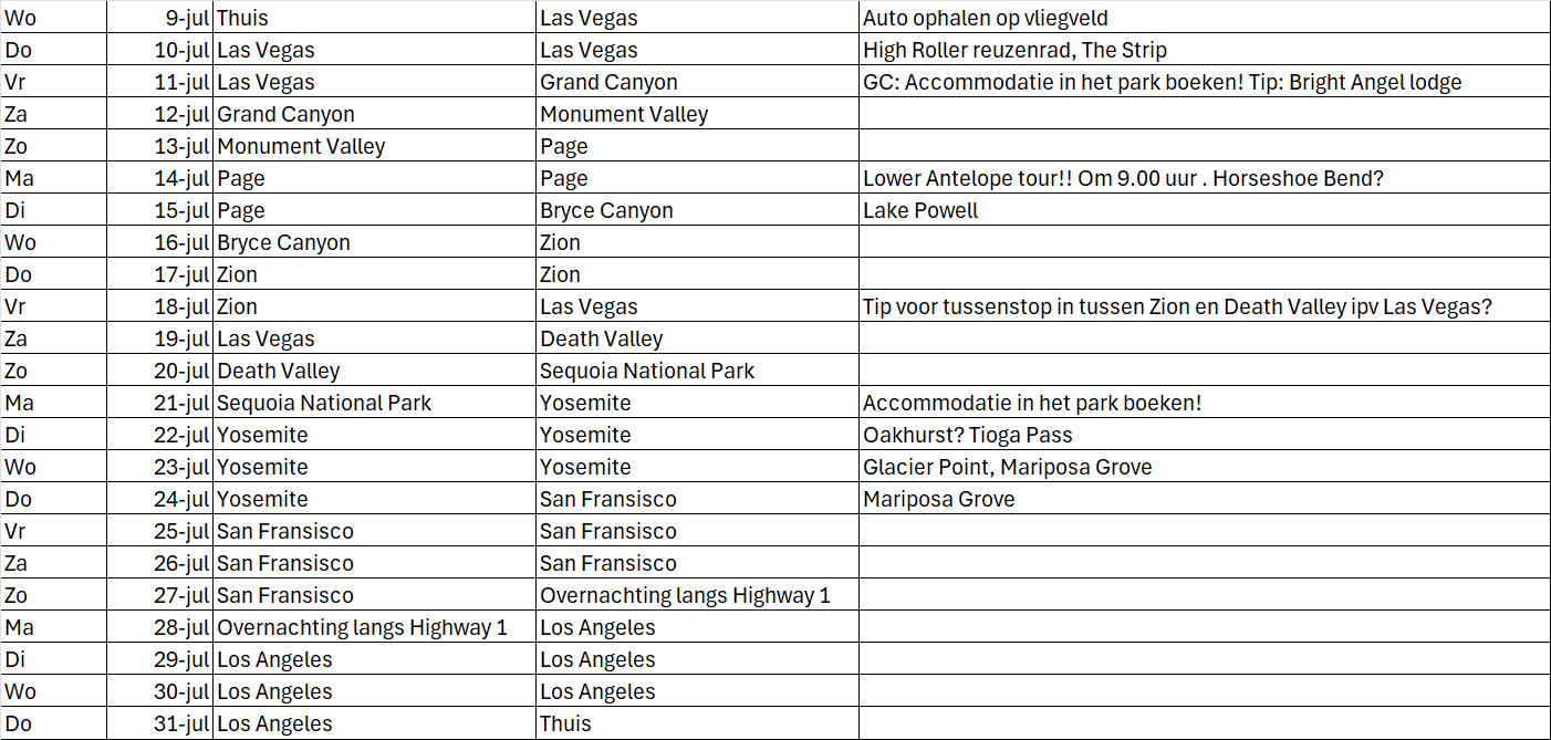 Sequoia dan toch ook maar geschrapt nav jouw reactie. We willen niet een te gehaaste reis en de tijd nemen voor alles. Mijn 2 dochters willen natuurlijk heel graag naar de steden. Daarom daar wat meer dagen voor uitgetrokken. Nu 1 dag LA geschrapt en daarvoor een extra dag langs de kust gepland. Ik denk dat ook dat heel relaxt is voor ze na het horen van goede verhalen van een collega!