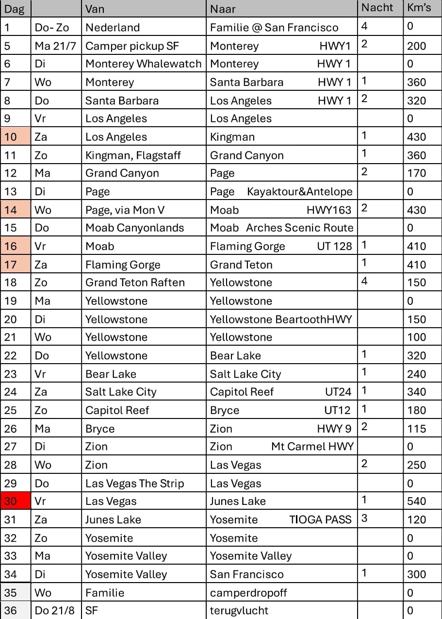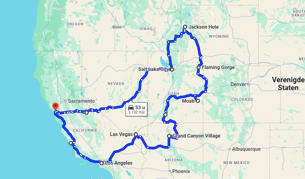 Dan de route: zet eens al je bestemmingen in verschillende volgordes in maps. Wie weet dat er een route tussen zit die minder kilometers geeft. Ik denk bijvoorbeeld dat je het beste eerst alles in Zuid West kan doen en dan van Yellowstone, via Salt Lake direct naar Yosemite kan rijden.