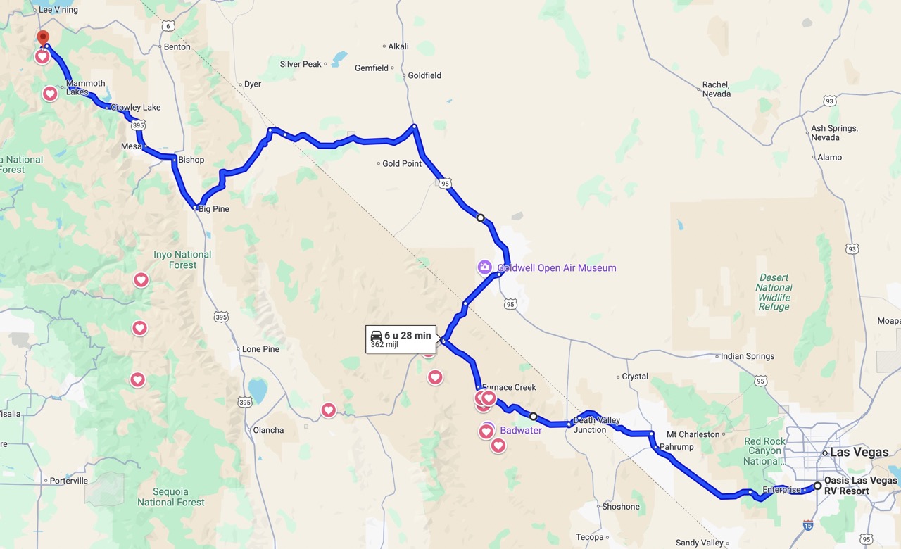 Een alternatief zou zijn om via het oosten binnen te rijden en de highlights zoals Zabrinski Point te bezoeken en dan via het noord-oosten terug buiten te rijden (zie afbeelding). Is dit een haalbare route met een camper in de zomer? De bergketen in het noord-oosten lijkt op Google Maps minder hoog/stijl maar is dit ook zo in realiteit?