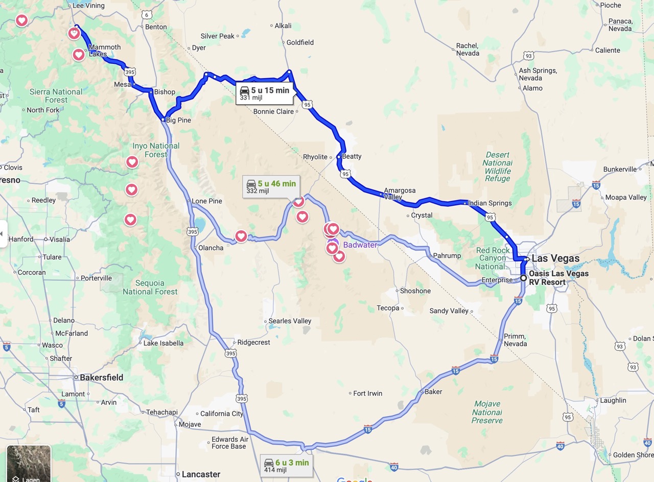 Kijk, dit maakt het toch een stuk duidelijker. Een dag minder Las Vegas is dus niet mogelijk, maar ik begrijp nu dat je na June Lake nog een overnachting hebt in Lee VIning. Dat geeft je dus wel degelijk de ruimte om al (veel) eerder dan June Lake te overnachten.