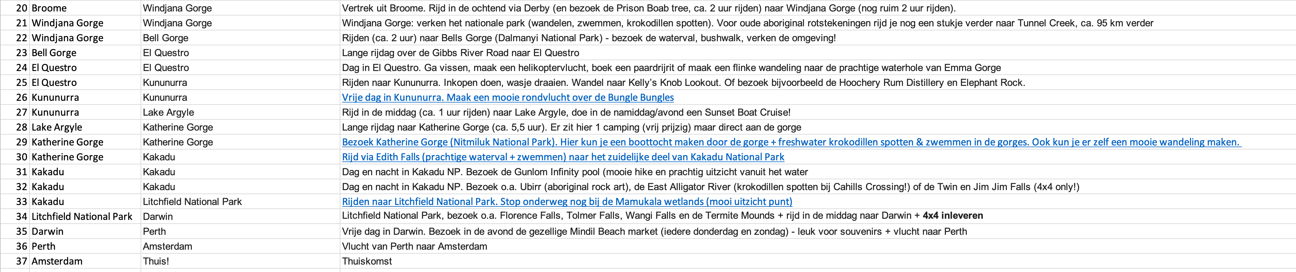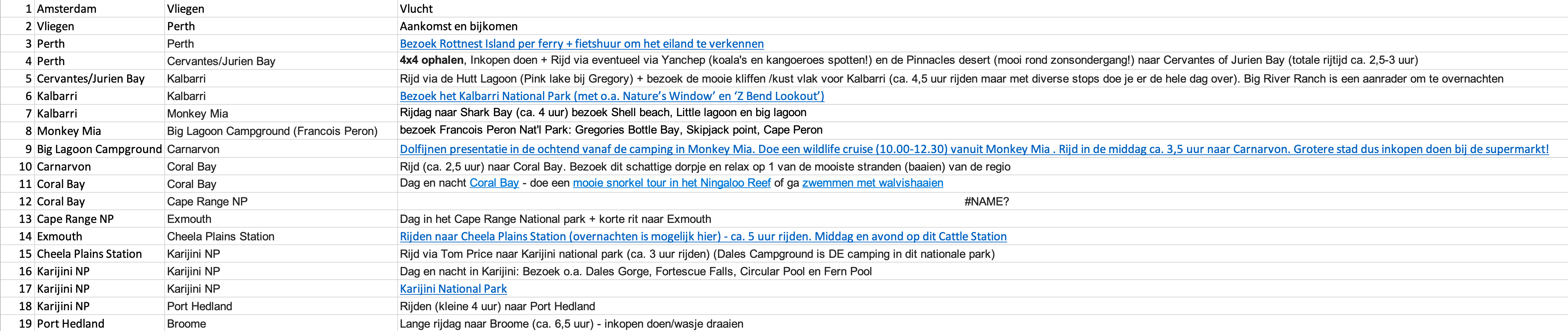 Na eerder vreemd te zijn gegaan willen we volgend jaar mei - juni een rondreis door westkust van Australië maken. Idee is om te starten in Perth en eindigen in Darwin. We hebben ongeveer 5 weken hiervoor uitgetrokken. We huren een 4x4 camper met daktent en slapen afwisselen op campings en of en toe lekker in een hotel. Zijn er mensen die deze route gereden hebben, en leuke tips kunnen delen? Of misschien een reisverslag? Onze route ziet er nu als volgt uit: