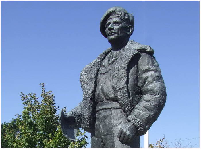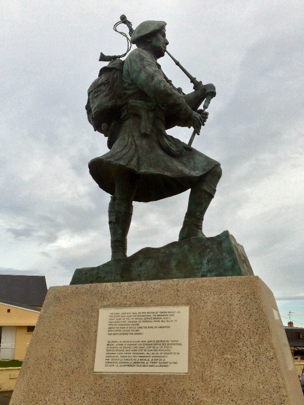 Op kop liep zijn persoonlijke doedelzakspeler Bill Millin. Millin speelde ook tijdens de landing op Sword Beach op zijn doedelzak, ondanks de strikte instructies van de Britse legerleiding dat dit niet toegestaan was. Dit standbeeld is de herinnering aan deze bijzondere actie. Het is een wonder dat deze man de oorlog heeft overleeft. In de sector waar hij aan land kwam vielen op Sword Beach veruit de meeste slachtoffers. Ook hier zijn nog meer diverse herdenkingsplekken aanwezig.