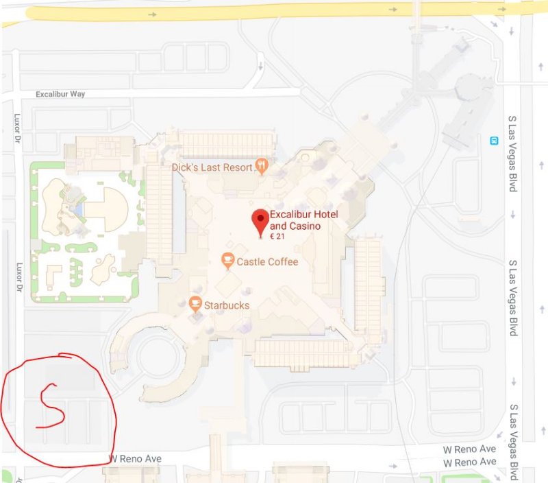 De parkeergarage ligt ter hoogte van je omcirkelde S maar dan aan de andere kant van Luxor Drive. Als je op Google Maps of Earth zoekt opParkeergarage Excalibur zie je het precies.