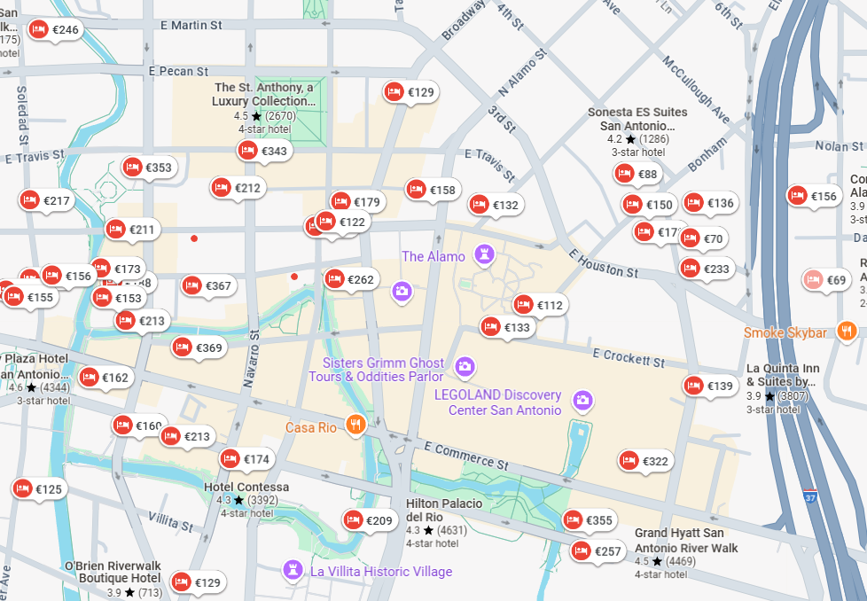 Bijvoorbeeld een willekeurige nacht in april, als je dan kijkt naar wat de opties zijn dan zie je dat er honderden hotels in San Antonio zijn, varierend in prijs van 37 euro voor een Super 8, 8km buiten het centrum, met 3,4* op Google, tot 367 euro voor het 5* Omni aan de Riverwalk met 4.4* op Google. Beide geven je een bed voor de nacht.