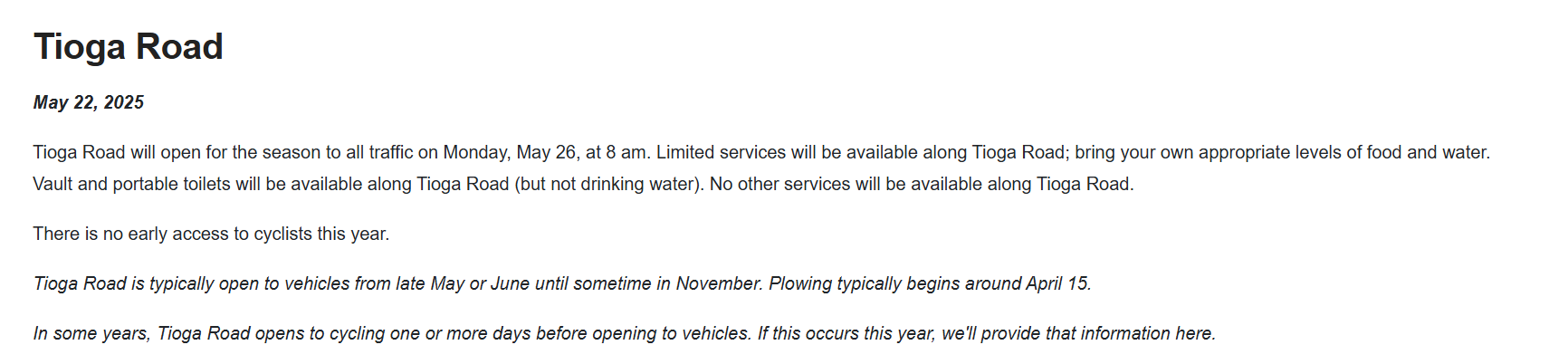 Ik zag het (bron nps.gov/yose). Net niet voor het Memorial weekend dus, dat zal wel te maken hebben met het nog ontbreken van voorzieningen.