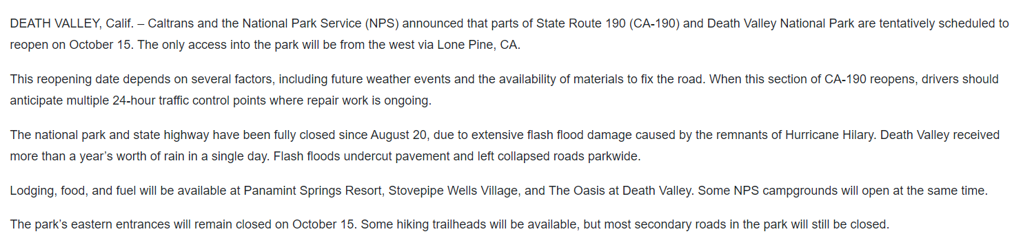 Some hiking trails will also be accessible, but most secondary roads in the park will still be closed. If you want to stay with us, Sunset, Furnace Creek, Texas Springs, and Stovepipe Wells Campgrounds will be open. Lodging will be available at Panamint Springs Resort, Stovepipe Wells Village, and the Oasis at Death Valley.