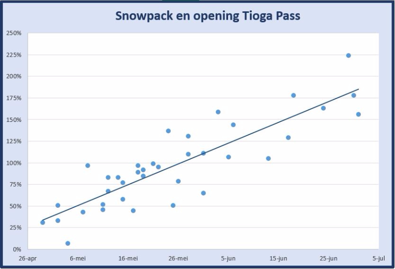 De (relatieve) snowpack op 1 april geeft een aardige indicatie van de openingsdatum, hoewel er veel meer factoren zijn die van belang zijn (zoals reparaties aan de weg).
