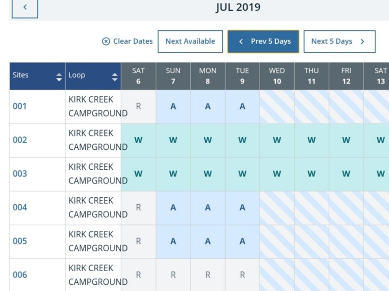 plaatje plakken lukt me niet, maar misschien kun je met me meekijken. Heb nu hetzelfde bij Kirk Creek Campground. Ik wil daar 21 juli overnachten en kan dat al boeken ,weliswaar zijn alleen plek 2 en 3 te boeken en niet 9 of 10 die ik mooier vind liggen)