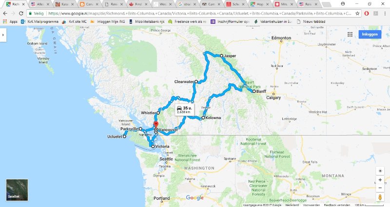 Dag, heeft iemand nog tips/adviezen e.d. over onze geplande rondreis in West Canada komende zomer? We zijn nu zes keer in de USA geweest, dus nu maar eens naar Canada. Wij houden van wandelen, wildlife zien en rust. Beetje gezelligheid tussendoor in dorpjes zou leuk zijn, maar niet teveel drukte graag. Ik begrijp dat we de toeristische route nemen, maar ja, dat zal niet voor niets zijn dat de meeste mensen deze route rijden. De kids zijn groot en gaan niet meer mee, dus lekker met zijn tweetjes. Het ziet er dan ongeveer zo uit: