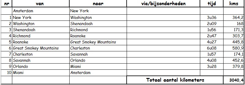 . Op jullie schema zie ik de tijd van New York naar Washington als 3,5 uur aangegeven, dat is dan wel boven de snelheidslimiet en zonder enig ander verkeer. Wij hebben dat nooit gehaald en zijn niet de langzaamste chauffeurs. Realistischer is 4,5 tot 5 uur, want die route is vrijwel altijd druk met tol en files.