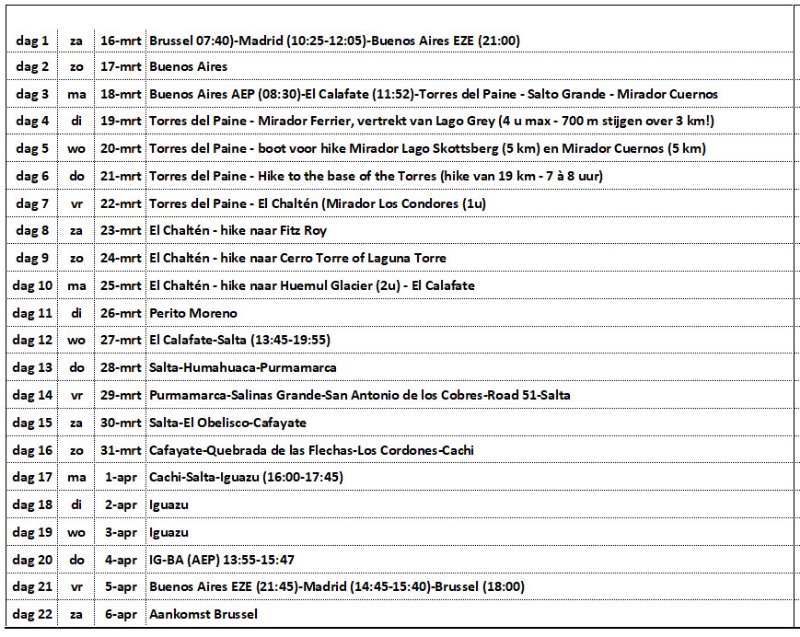 Onze planning is inmiddels rond. Alle vluchten, hotels en auto's zijn geboekt. In Torres del Paine en El Chaltén kunnen we de planning uiteraard nog aanpassen, ook al afhankelijk van de weersomstandigheden.