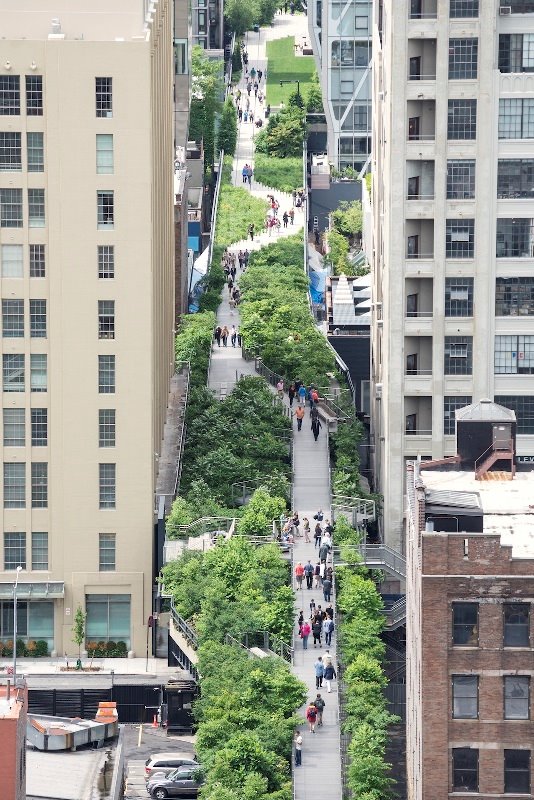 Het is the Highline, met zicht op de kruising met 26th street, de blik naar het zuiden.