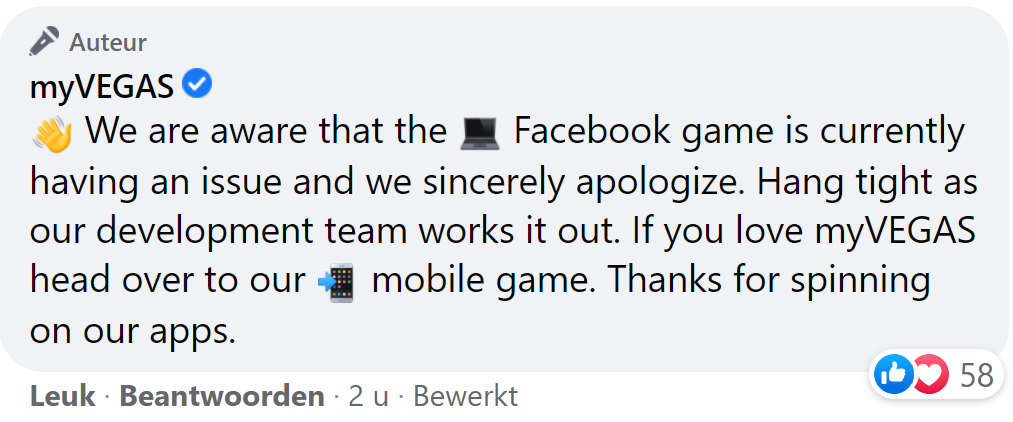 Lijkt erop dat MyVegas eruit ligt. Op de FB pagina van het spel lees ik ook veel klachten.