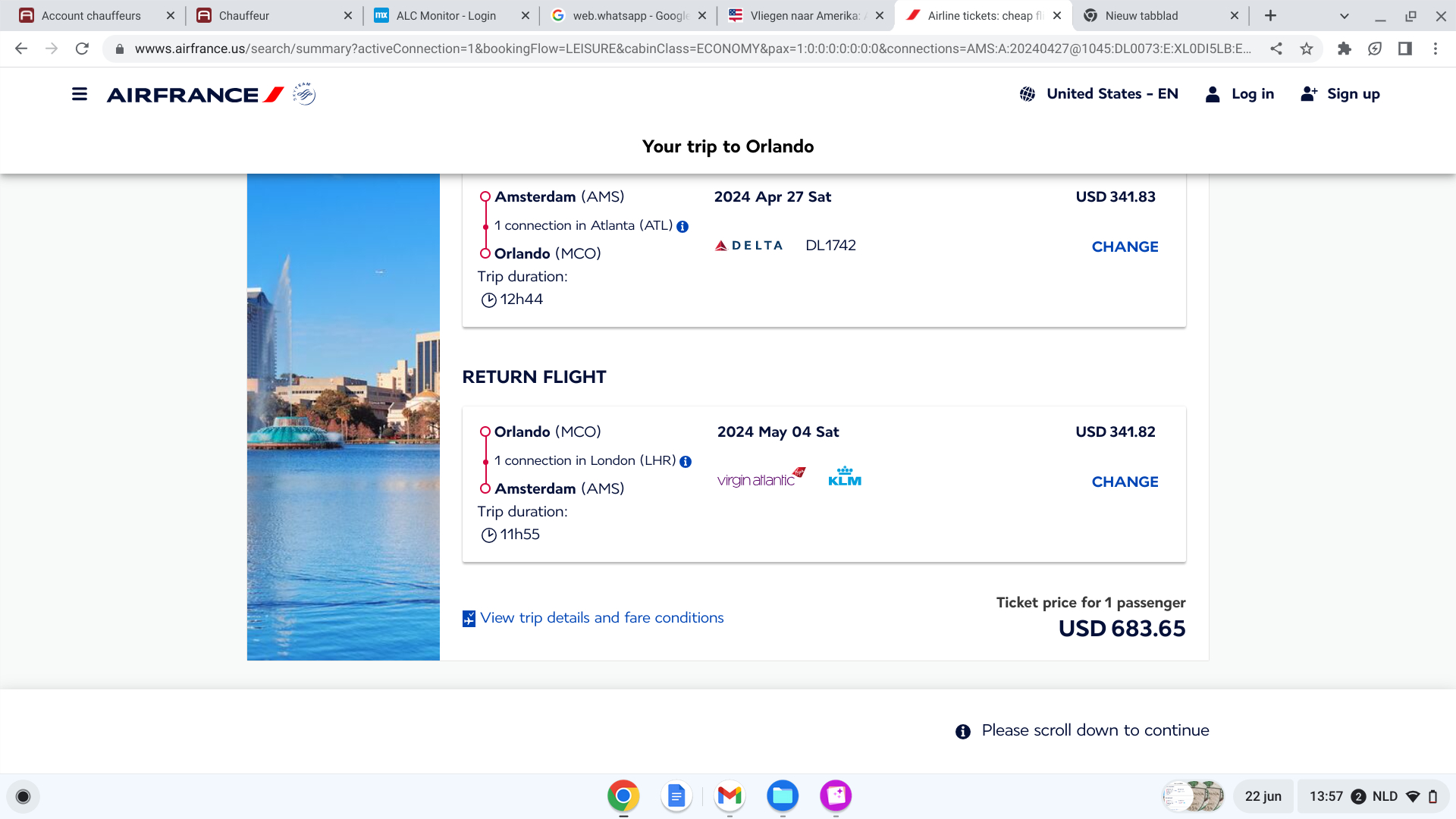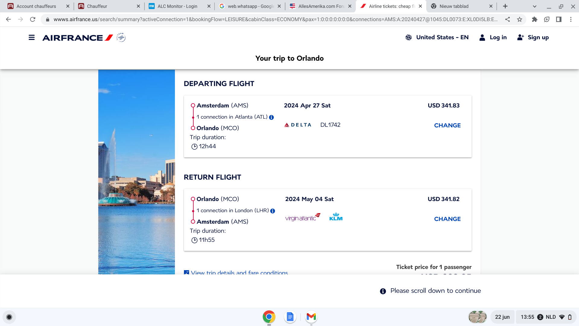 Ik zou hier - zeker met kinderen - niet aan beginnen. Dan is de vlucht die Bedeve aanprijs beter. Heb je ook gekeken op klm.de/klm.us/airfrance.us of de prijs daar lager is? Dat wil nog wel eens schelen. Persoonlijk kijk ik - met kinderen - het liefst naar vluchten die uiterlijk 18.00 uur landen. Wanneer je een overstap in de VS hebt, mag dat iets later zijn, want dan hoef je niet meer door de douane. Wat voor het ritme voor mij prettig werkt, is landen in het licht, avondeten en een beetje op een normale tijd naar bed.ikbeneva schreef: ↑21 jun 2023, 21:50Alleen…. We vliegen redelijk laat in de middag en we komen daardoor na middernacht aan in Orlando. Zouden jullie dit doen? Is dit een k*t tijd? Kan ik beter dan toch iets meer uitgeven en ‘s ochtends of begin middag vliegen? Of is het prima tijd, prima overstap en gewoon doen?