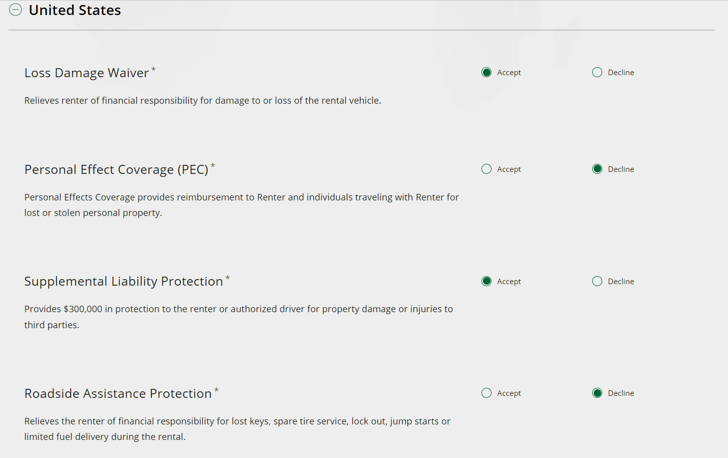 Je moet de schuifjes voor LDW/CDW en SLI/LS aan zetten volgens mij. Jij weigert nu deze verzekeringen.Elliswonderland schreef: ↑23 dec 2024, 07:48bij National worden niet automatisch de LDW en de SLP toegevoegd bij een proefboeking en dat terwijl wel al onze schuifjes op decline staan