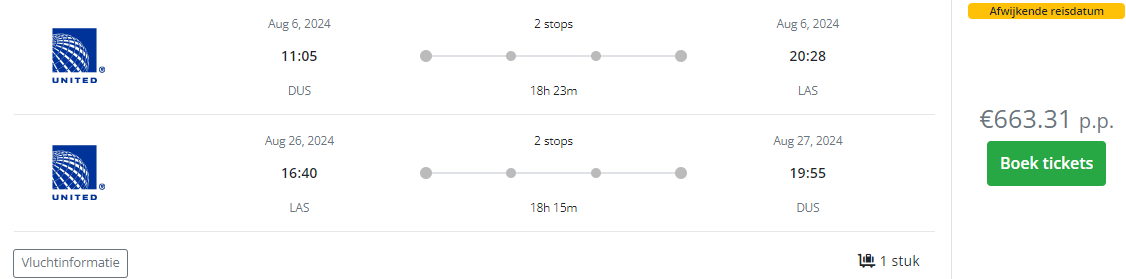 Nu had ik een mooie deal, zowel Google Flights als Kayak gaven aan van DUS naar LAS: €2350 voor 4 personen, inclusief bagage en stoelreservaties.
