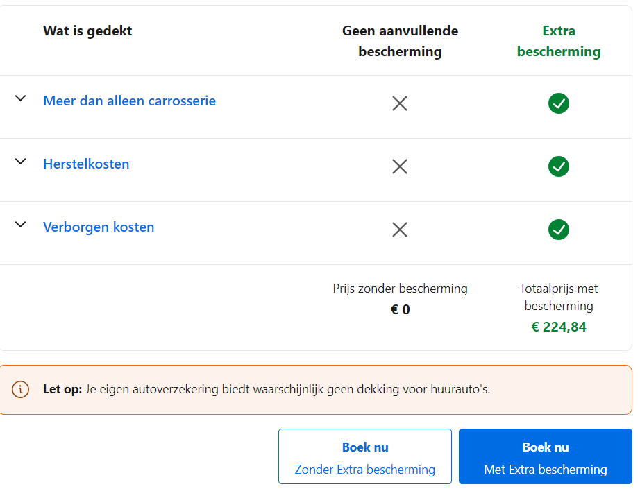 Ik heb een leuke prijs gezien bij Booking en krijg bij het boeken deze optie: Ik heb niet eerder een auto gehuurd bij Booking en heb dus nooit deze keuze hoeven te maken. Is het verstandig om met extra bescherming te boeken of is dit overbodig?
