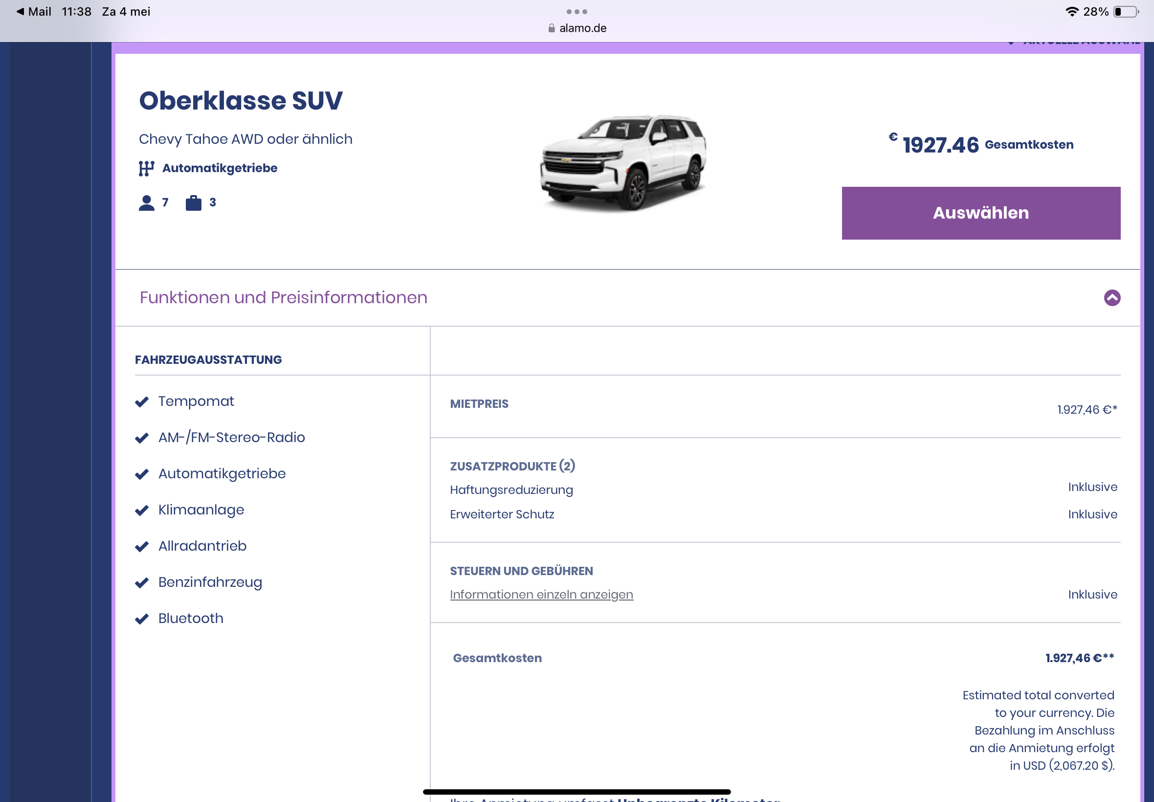 We zijn beiden liefhebber van een fijne auto met een pittige motor, maar hebben totaal geen kijk op/verstand van de Amerikaanse merken. Hebben een auto gehuurd via Alamo.de, Standardklasse Elite SUV (Audi Q3, Cadillac XT4 oder ähnliche). Als we zover zijn om de auto uit te kiezen (hopelijk is er iets te kiezen