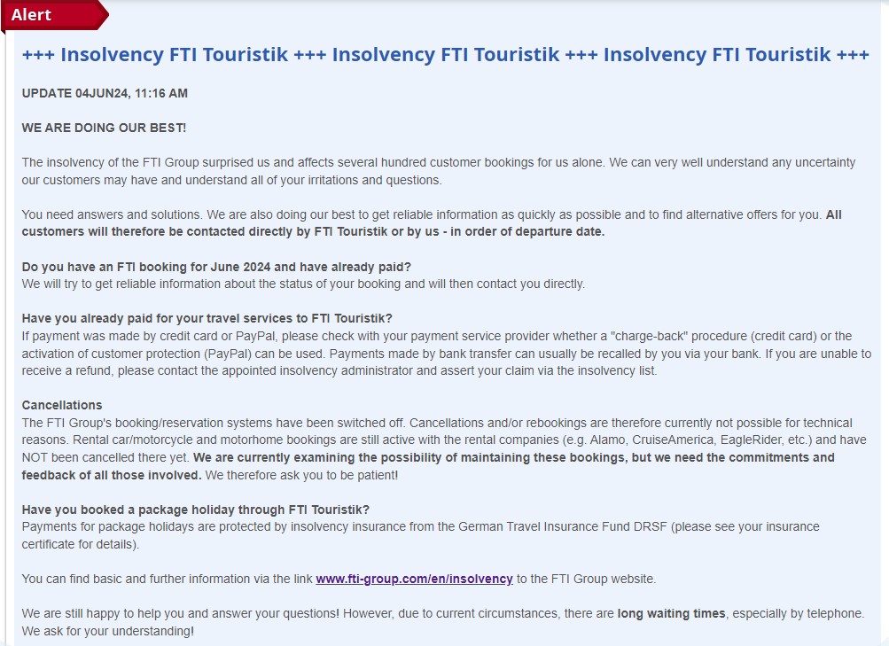 Status is nu dat men voor campers probeert boekingen te handhaven, evt. Via andere touroperator. Voor korte termijn zijn boekingen nog steeds gereserveerd, maar moeten wel (opnieuw) betaald worden aan de verhuurbedrijven. Verzekeringen liepen ook vaak via FTI, dus die vervallen sowieso.