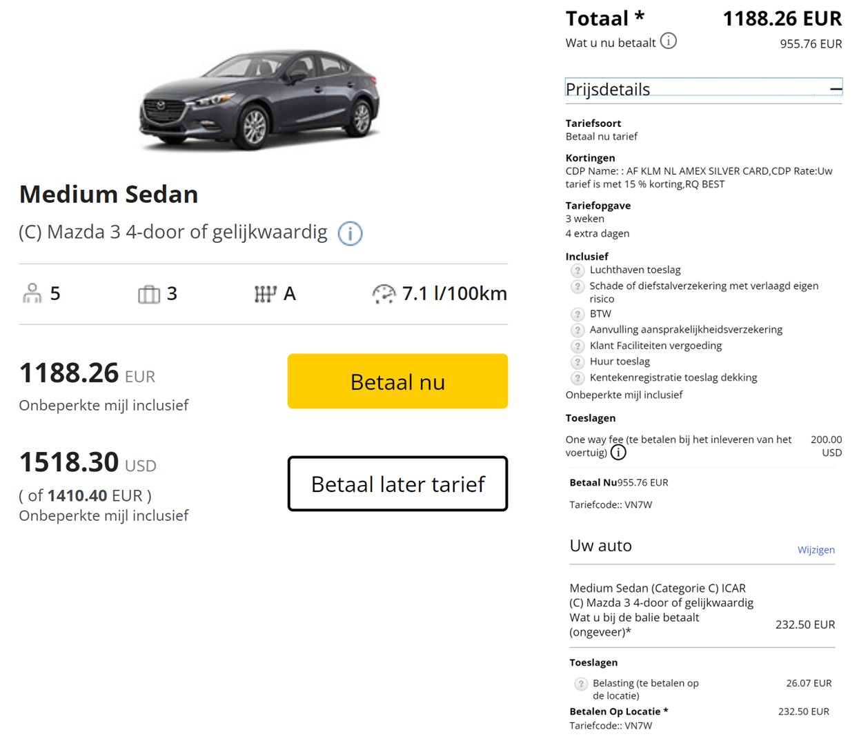 Of is het €232,50 betalen bij ophalen en nog eens aanvullend $200 one-way fee bij inleveren? In dat geval is er geen enkel prijsvoordeel voor het betalen vooraf.