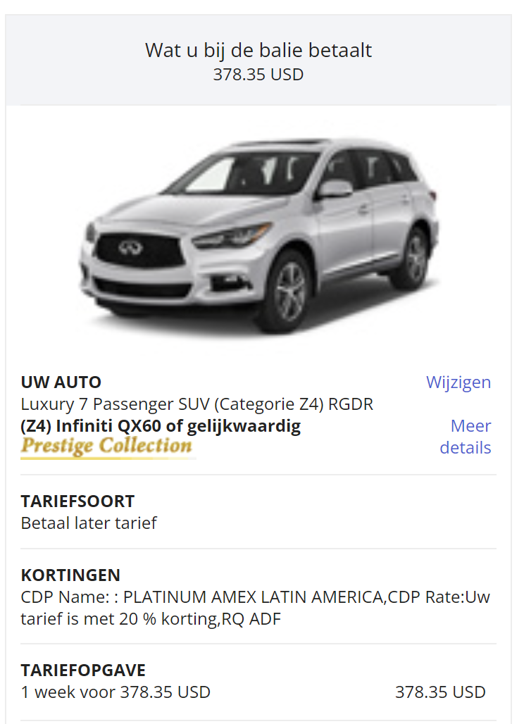 Maar als ik inlog bij Hertz (en alleen daar; dat doet vast niet iedereen) dan staat er dat het een CDP is voor AMEX Platinum Latin America. En als ik reviews ga lezen dan zijn er best wel wat mensen die weggestuurd worden (of bij moeten betalen) omdat ze niet in aanmerking komen voor de geboekte korting.