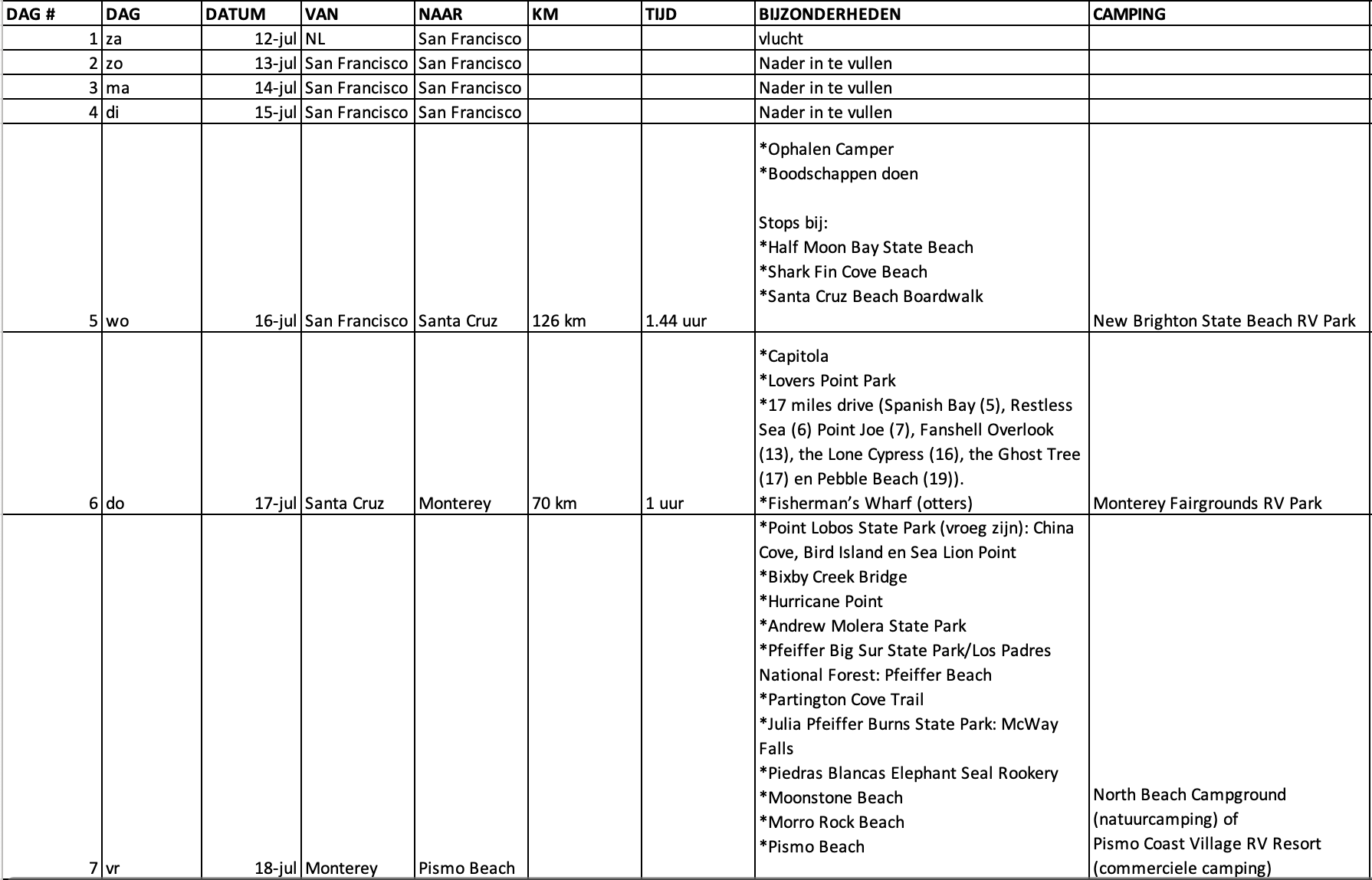 Ik vind het een prachtige route! Lekker lang. Met een camper in SF zou ik trouwens echt nog eens overwegen of je daar wel 4 nachten wilt staan.