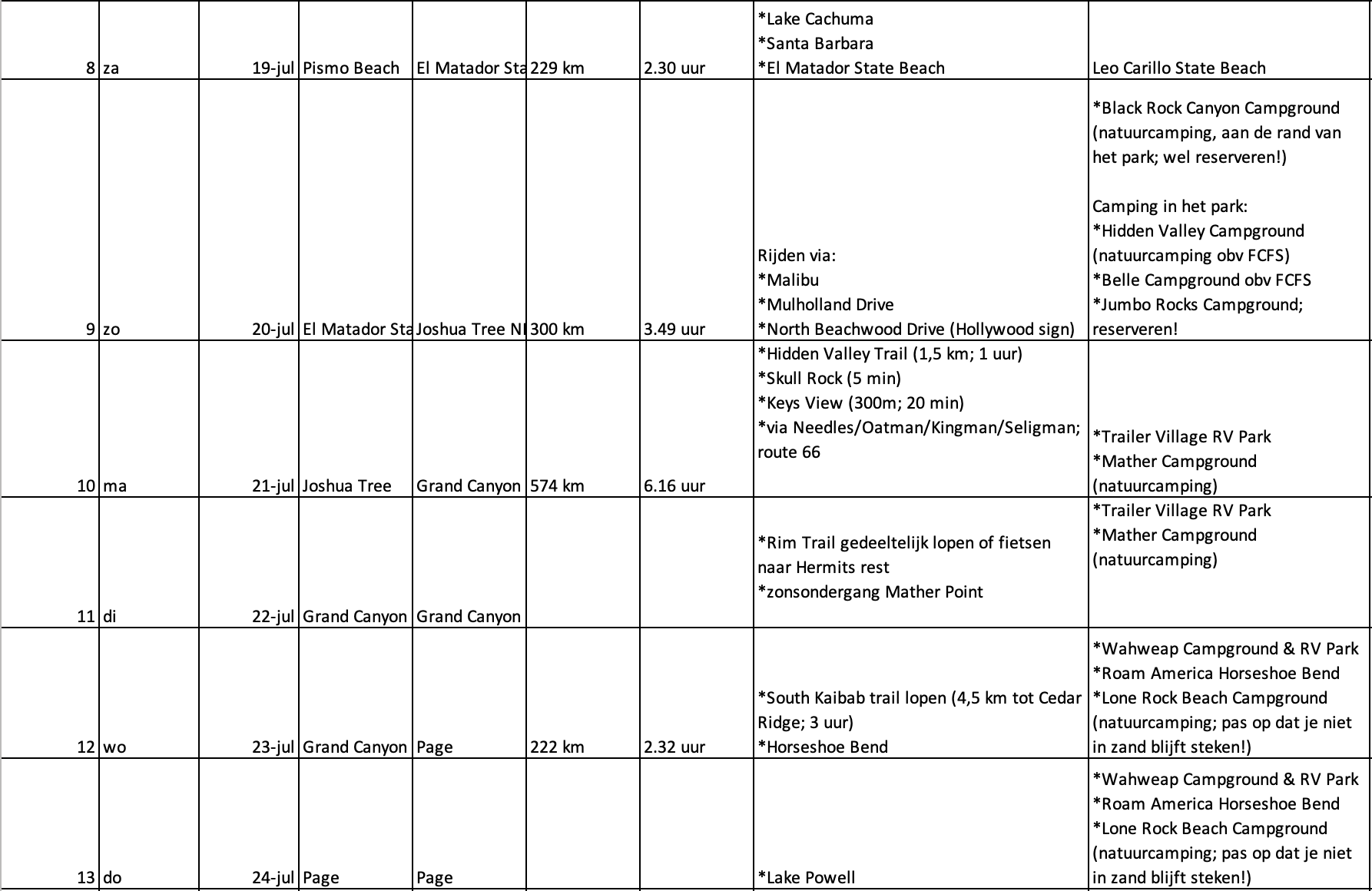 Naar aanleiding van de diverse tips hebben wij wat zitten schuiven met het schema. Voor nu 1 dag toegevoegd bij GC, Moab en Page. De tussenstop op de reisdag van Joshua Tree naar GC nu eruit gehaald, waardoor dit wel een lange dag wordt, maar dat geeft ons 1 dag extra bij GC. De 3 dagen SF vooralsnog laten staan. Kings Canyon en Sequoia NP ook toegevoegd.