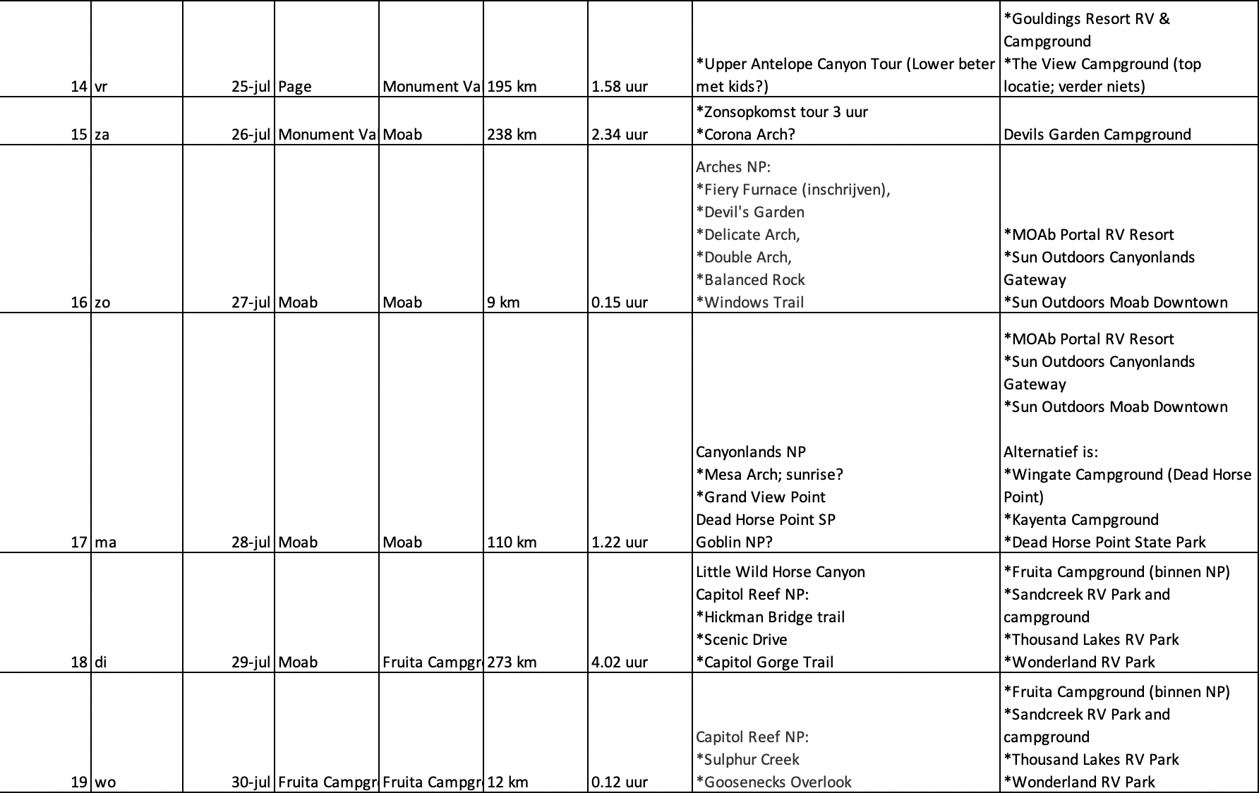 Tevens kunnen we wel wat hulp gebruiken wat betreft de keuze voor een camping. Onderstaand heb ik nu een aantal campings per stopplaats weergegeven. Zitten hier campings tussen die jullie zeker niet zouden uitkiezen of missen er juist leuke campings? We zijn dus van plan om zoveel mogelijk in de nationale parken te verblijven, maar het is de vraag of dat altijd lukt. Om die reden hebben we ook een plan B (en soms zelf een plan C). Jullie hulp hierbij is meer dan welkom.