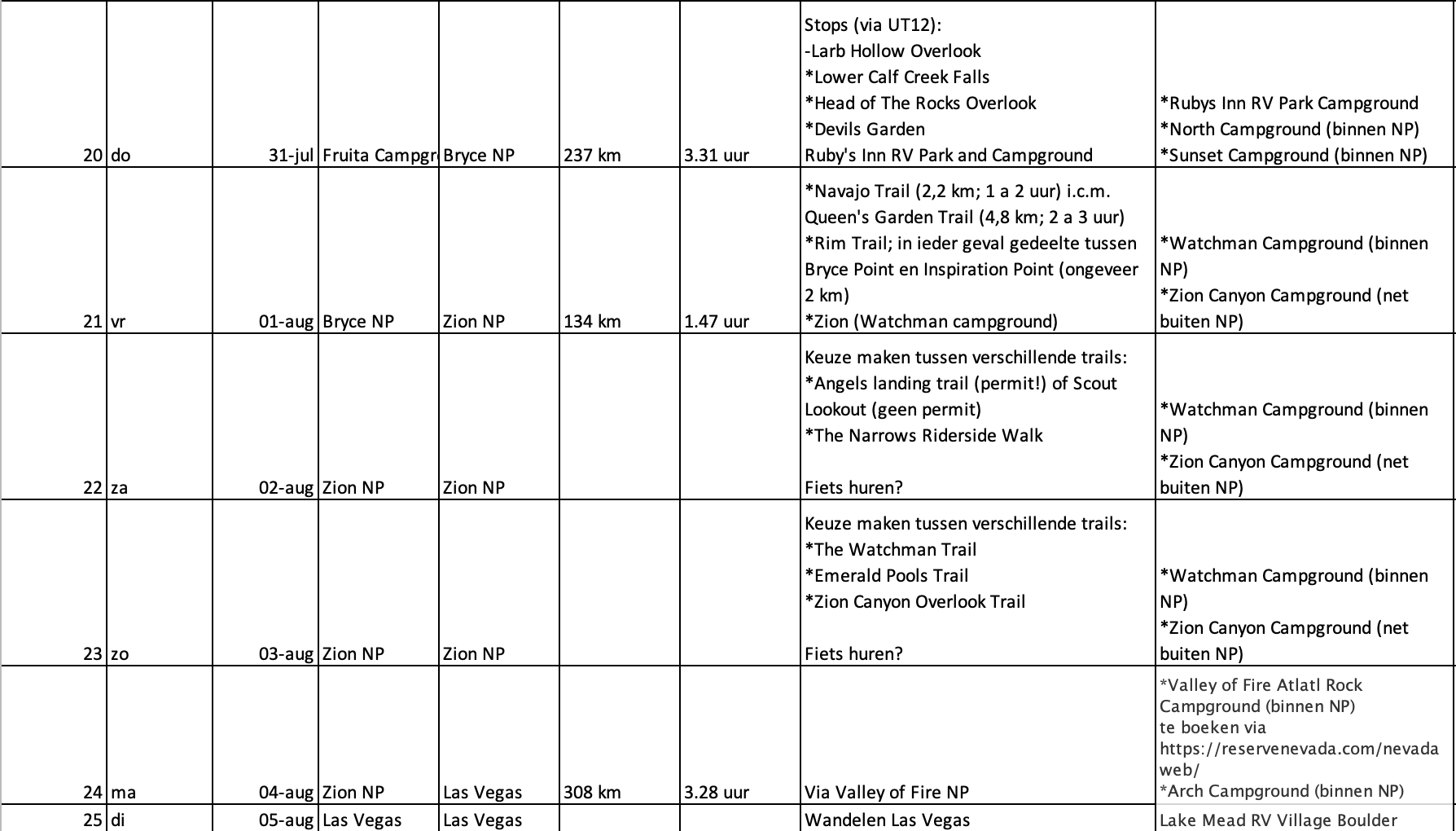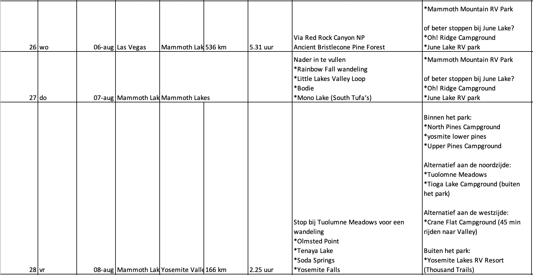 Wij overwegen om de route vanuit Las Vegas te beginnen en dan ons rondje tegen de klok in te doen. Op die manier zijn we eerder in Yosemite en zijn we daar do t/m zaterdag. Nog steeds niet ideaal wat betreft het weekend dus, maar al iets beter t.o.v. onze plannen om vanuit SF te vertrekken. Ook Zion valt dan niet meer in het weekend.
