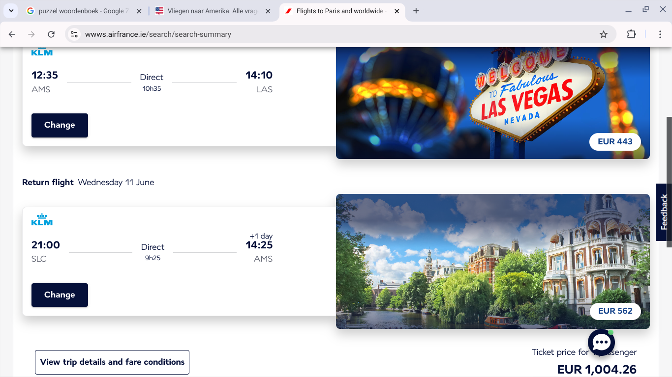 Wij willen op 16/5 van AMS - LAS (vertrek 12:35) en op 11/6 van SLC - AMS (vertrek 21:00) met KLM vliegen. Dit zijn twee directe vluchten. Kosten komen totaal uit op +- €2.300 voor Economy Standaard.