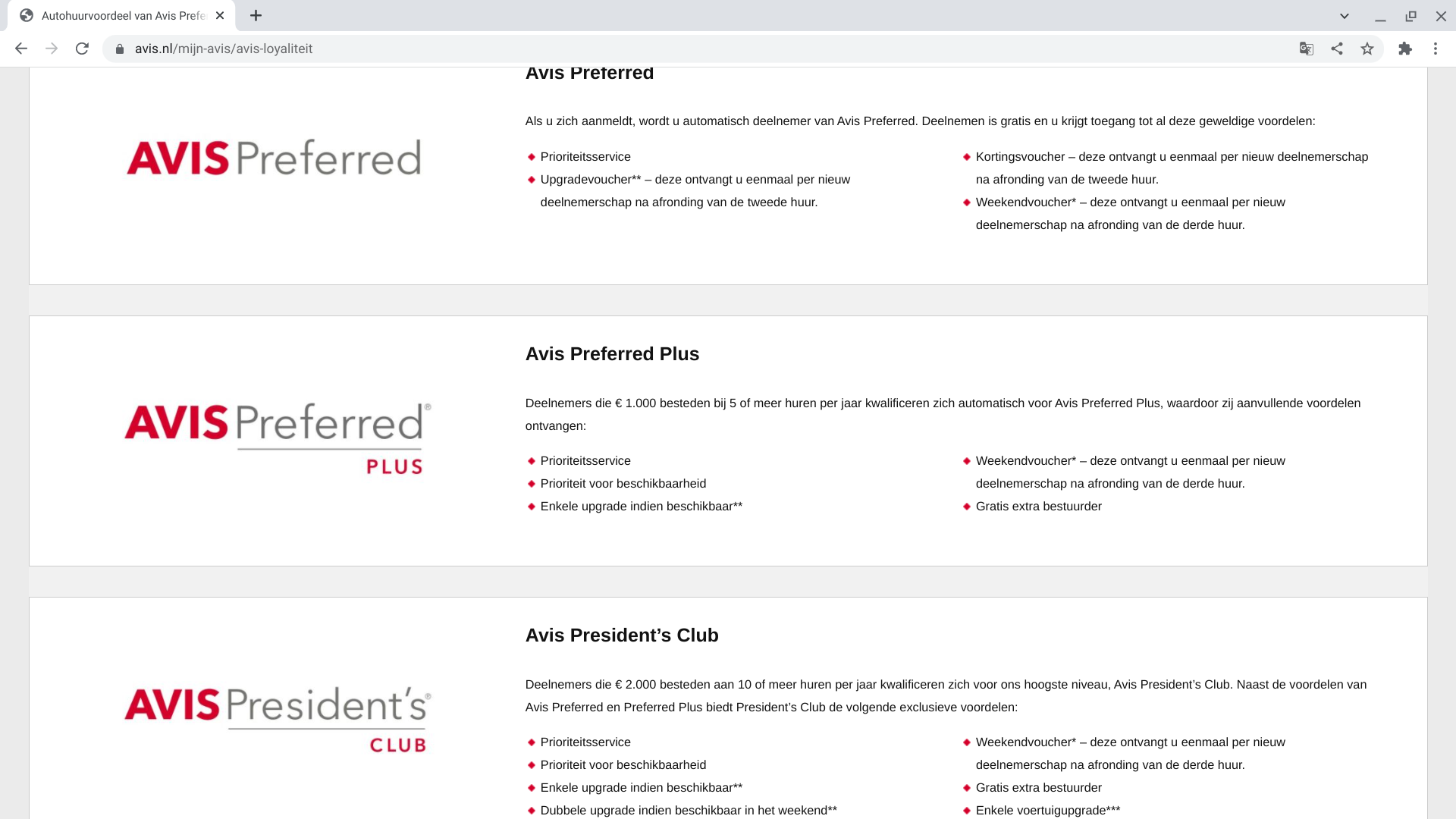 Ik heb Avis presidents circle qua loyaliteitsprogramma .